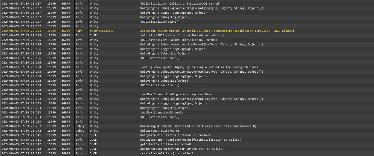 The main takeaway from researching this topic is that native audio plugins in Unity don't need to be loaded on startup. You can load them when needed, which helps resolve any initialization issues you might encounter. I previously thought there was no way to execute any code before the plugin was loaded, but I was wrong. Discovering this meant I could fully unlock the potential of JUCE plugins in Android Unity projects.